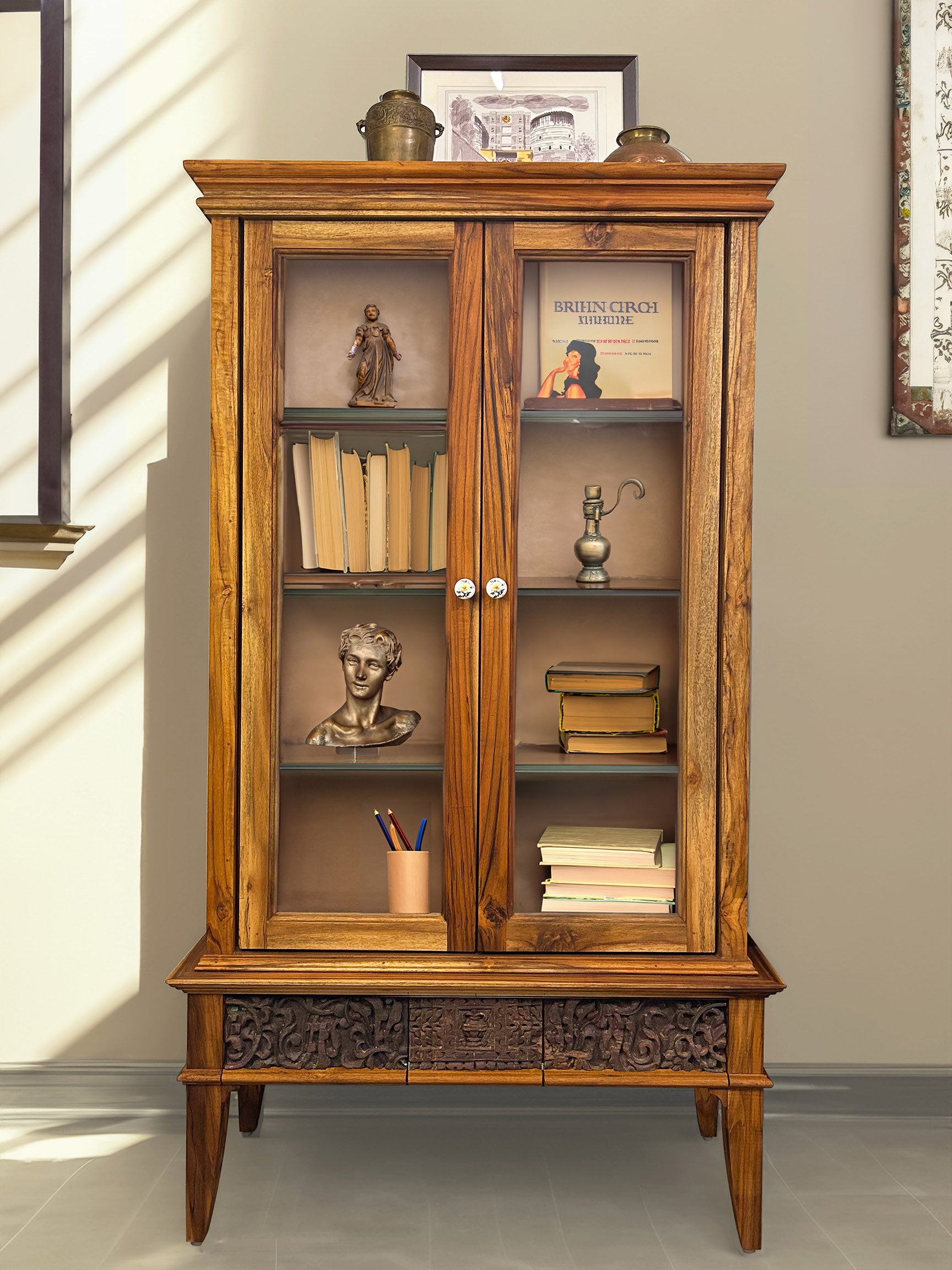 Kapaatika features a beautifully handcrafted panel at the base, reflecting Indian design elements. The cabinet is polished with tel-paani to highlight the natural beauty of teak wood's intricate veins. It's more than just a cabinet; it's a statement of sophistication and heritage.